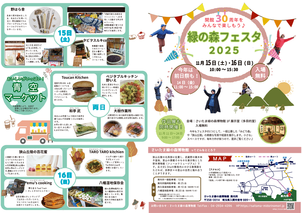 さいたま緑の森博物館のお祭りです。ネイチャークラフトやツリークライミングなど、里山の自然とふれあう遊びや各種プログラムで一日楽しめます。青空マーケットでは、地元農産物やキッチンカーの出店もありますのでぜひお出かけください。