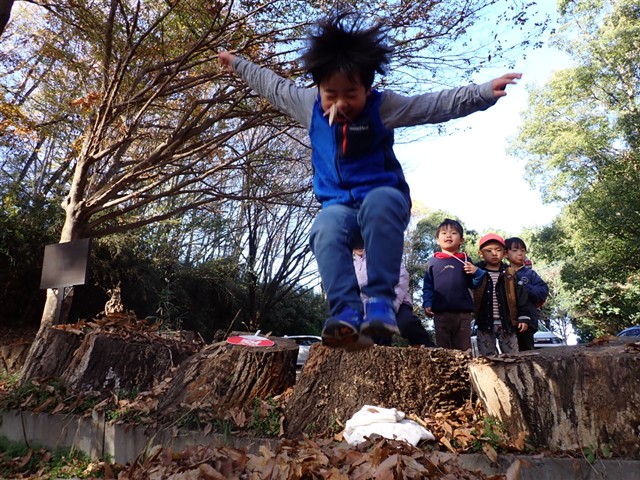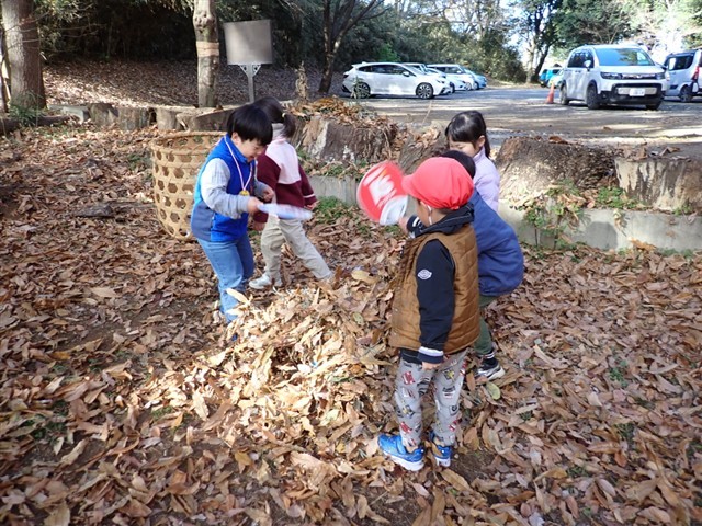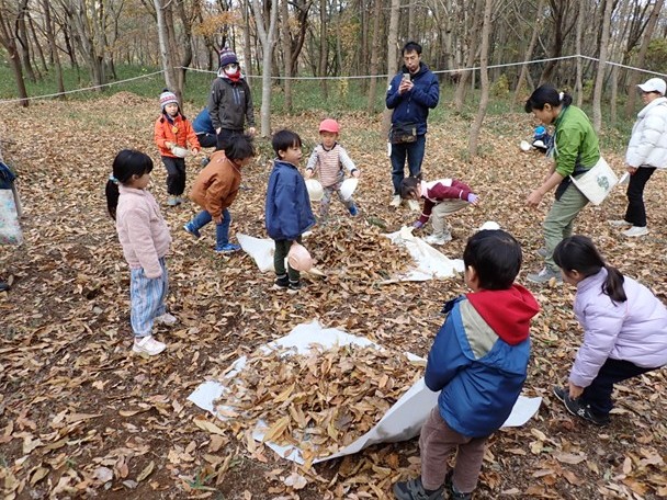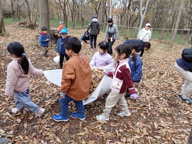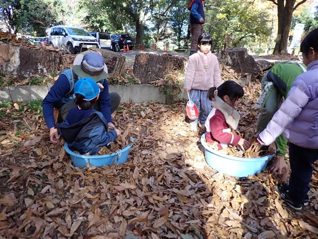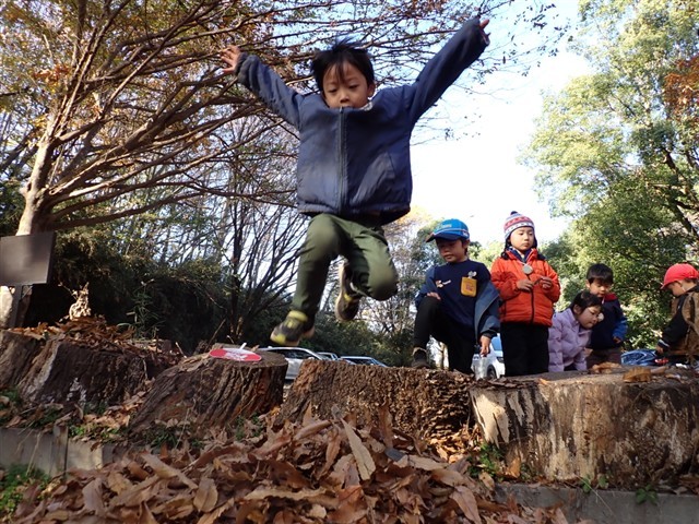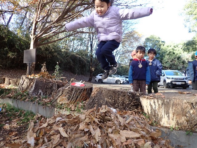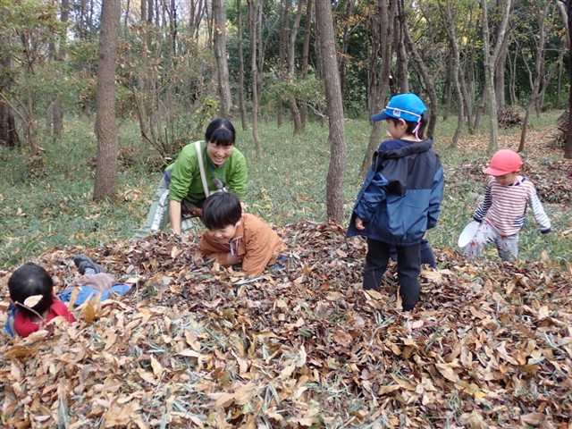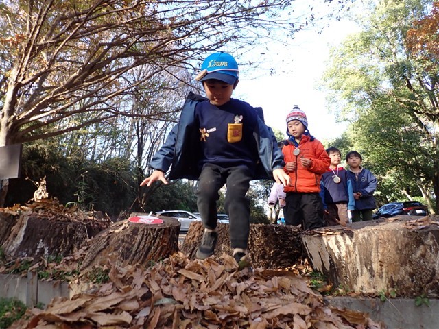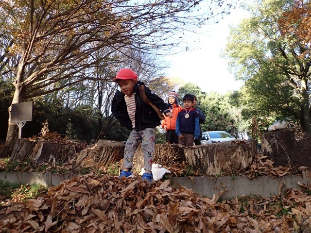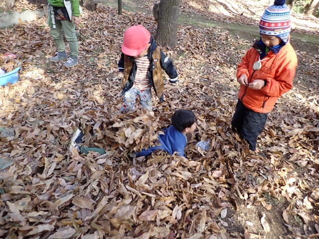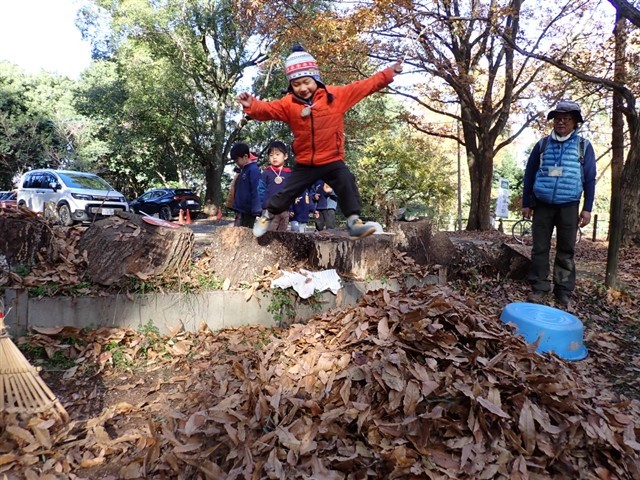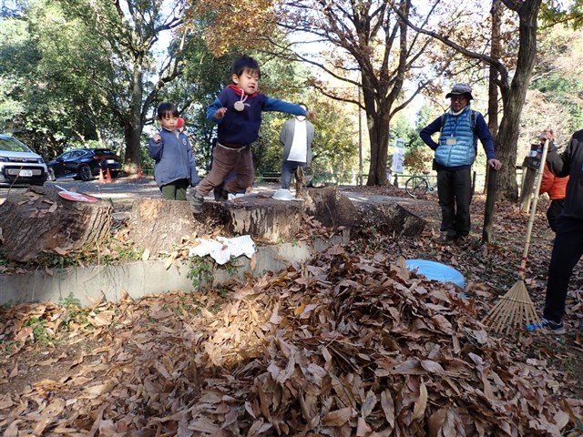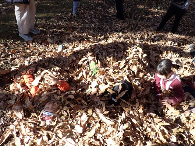 落ち葉を集めるところからスタートし、溜まったら、宝探しゲームや落ち葉ジャンプなどを楽しみました。