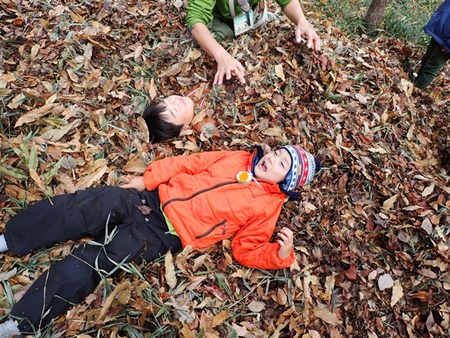 ↑のんびり過ごしていたチームは、落ち葉のお布団から出たくなくなり、