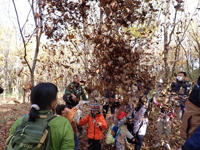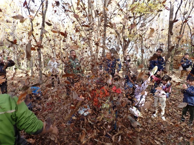 2回目までは穏やかに、3回目は大人たちで大量に持ち、せ~ので落ち葉を投げました。
