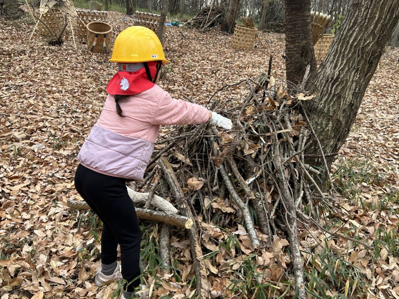 落ち葉を集めるエリアに付いたら、先ずは良い堆肥を作るために枝拾いから始めます。
