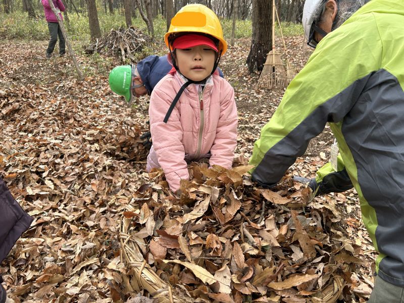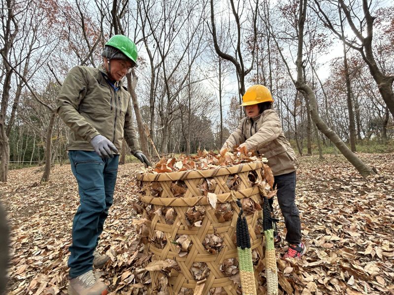 ある程度集まったら落ち葉を集めて籠に詰めます。