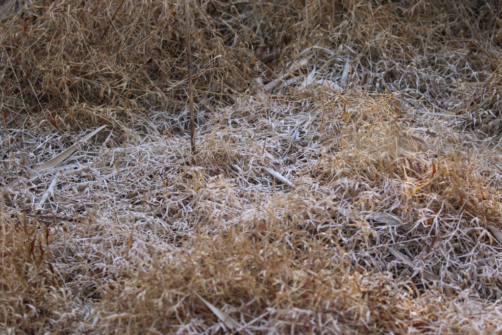 冬の散策。今朝も氷点下まで下がったので、水鳥の池には氷が張って、地面には霜が降りていました。