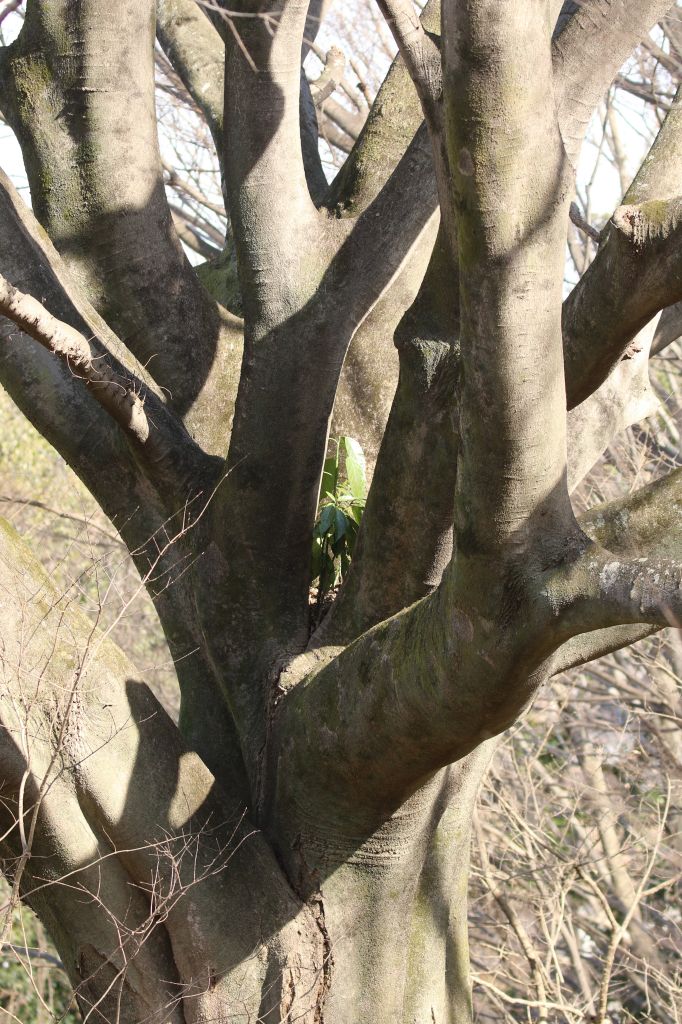 高い木の枝先にあるオオカマキリの卵や、細い枝にのっかっているだけに見えるアシナガバチの巣、エノキの樹の枝の間から生えるアオキなど。