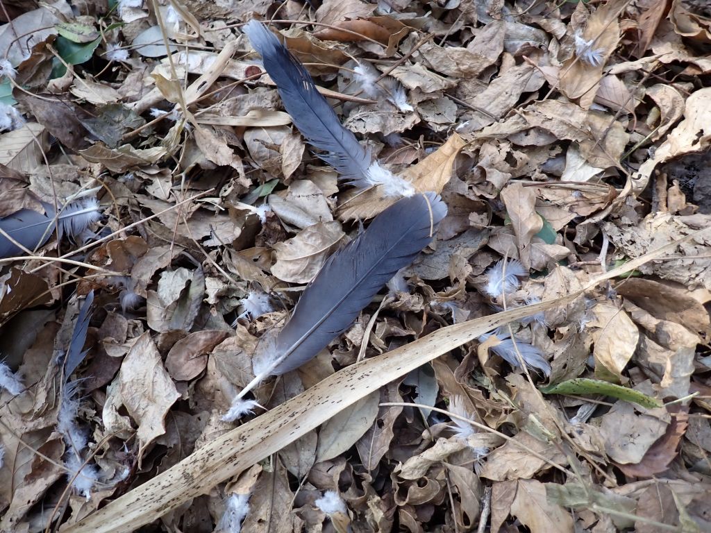 森の中では、モズやシメといった鳥にも出会った他、キジバトが何者か(おそらくタカの仲間)に襲われた跡もありました。