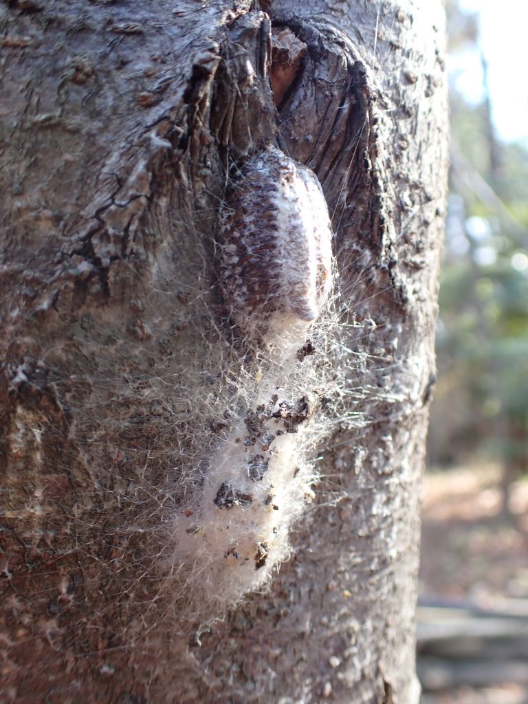 やはり目線より高い木の幹だったのですが、ハラビロカマキリの卵鞘とジョロウグモの卵のうが並んでついていました。