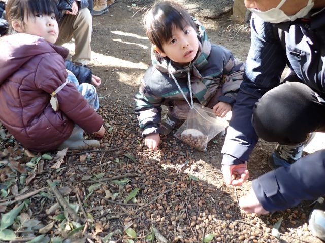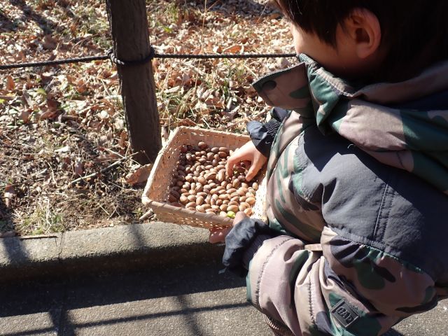 元々の豆まきについてのお話をした後に、「みどり森では鬼はいないので木の実を集めて、それを撒こう!」