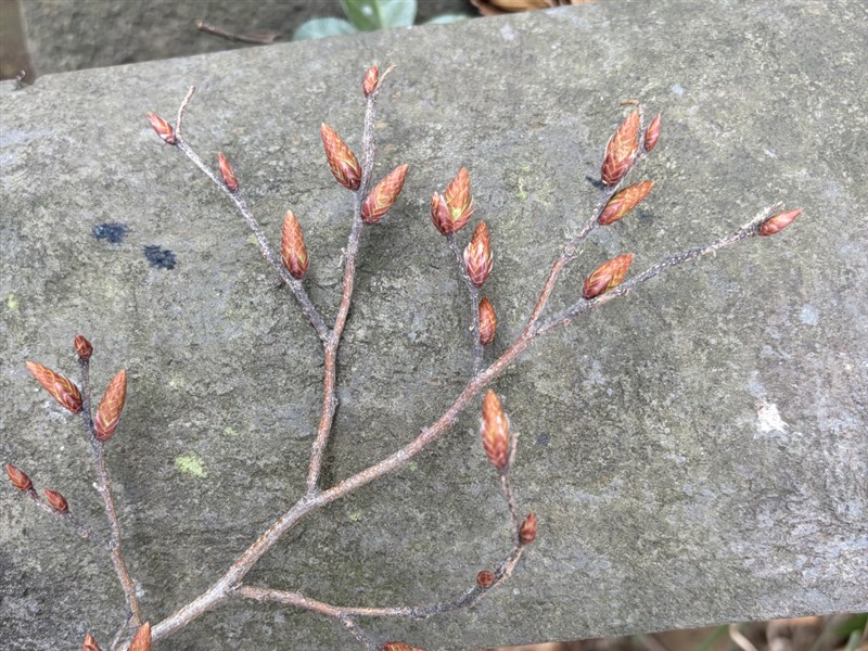 シデ類の枝先が折れて落ちているものがあったので、拾って眺めてみると、だいぶ芽が膨らんできた様子。