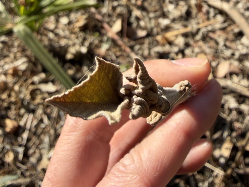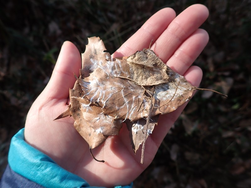 まわりの落ち葉も見てみると、わお!白い菌たちが葉の裏に延びていました。