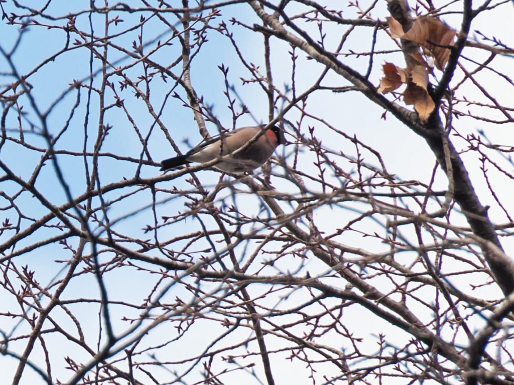 暖かで歩くのも快適な日。色々なものに出会えることを期待して、大谷戸コースを歩きました。 案内所を出てすぐに、木の上の方で鳥が何羽かいるのを同行者が見つけてくれました。双眼鏡で見てみるとシジュウカラとメジロがいました。さらに大き目の鳥を見てみると、ウソでした。盛んにサクラの芽を啄んでいます。あんまり食べるので春になって花が咲くかちょっと心配です。