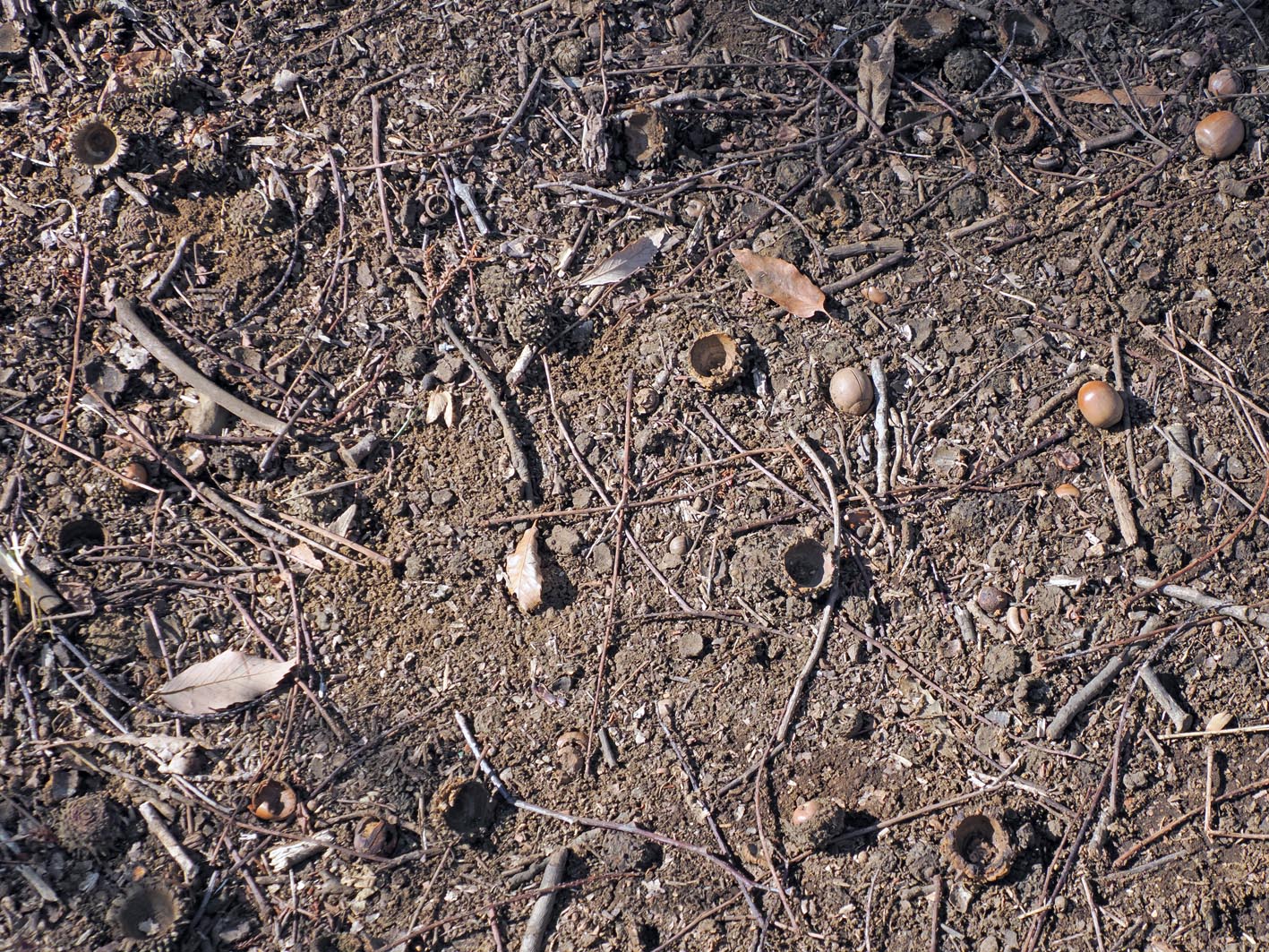 雑木林広場へ向かう途中でウグイスカグラに出会いました。花が2輪だけ咲いています。 さらに先に進むと、この時期にしてはきれいなクヌギのどんぐりが落ちていました。日曜日に雪が降ったせいで今頃落ちたからなのかもしれません。