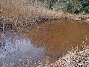トンボの湿地には薄い氷が張っています。カエルの卵塊を探してみましたが、見つかりませんでした。まだ早いようです。