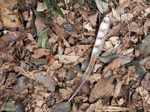 足元に豆の莢(さや)が落ちていました。よく見ると碁石のような形の豆も落ちています。木の上に絡んでいたフジつるから落ちたようです。