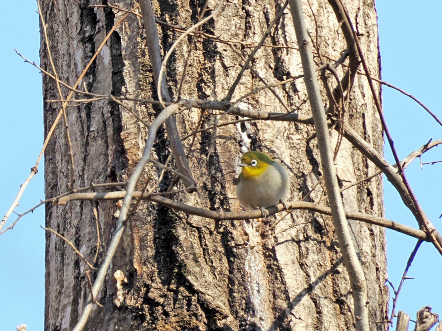 雑木林広場から降りてきて展望広場にかかると、メジロが大きな木の幹の周りで、何かを探しています。ヤマガラは落ちていた木の実を拾い、木の上でコンコンコンと音を立てながら実を割っていました。