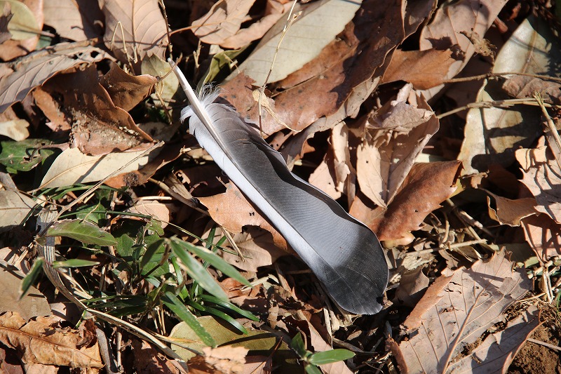 右の写真もドバトの尾に近い部分の羽のように思います。風切羽とは大分離れた所にあったので、それぞれ別の個体が狩られたのか、タカが羽を抜きながら移動したのか、それともハトが命からがら逃げ続けたのか気になるところです。
